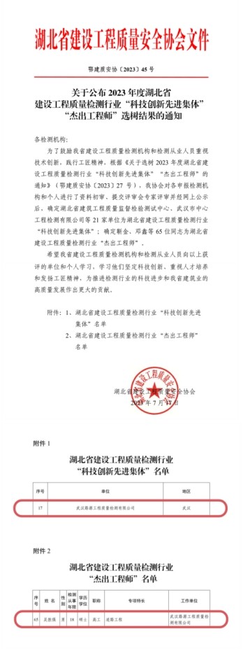 祝賀!市政設(shè)計(jì)院所屬路源公司及員工榮獲2023年度湖北省建設(shè)工程質(zhì)量檢測(cè)行業(yè)“科技創(chuàng)新先進(jìn)集體”、“杰出工程師” 稱(chēng)號(hào)。