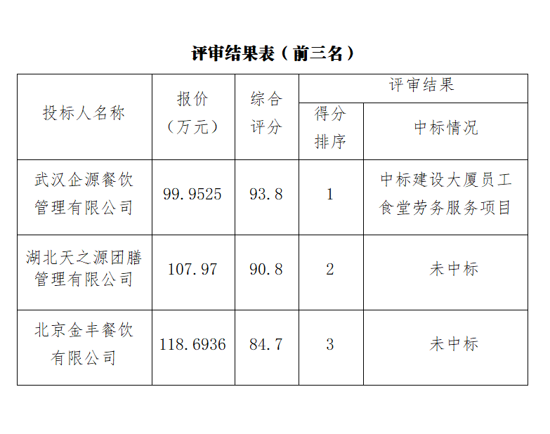 ? ? 經(jīng)評審,綜合評分排名第一為武漢企源餐飲管理有限公司,報價為99.9525萬元/年,綜合評分為93.8分,中標武漢市政工程設計研究院有限責任公司建設大廈員工食堂勞務服務項目。