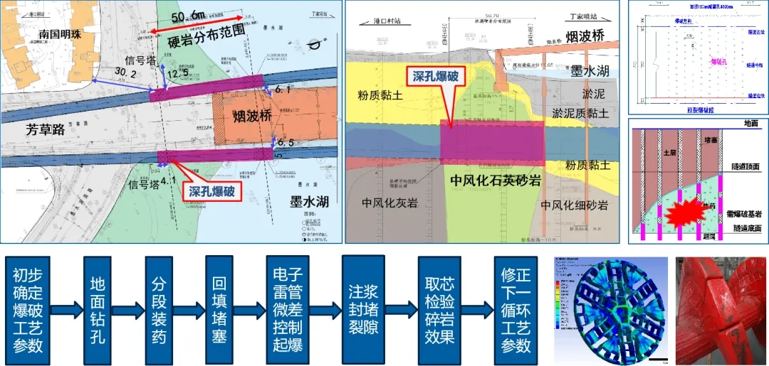 獲獎(jiǎng)項(xiàng)目《地鐵隧道穿越極硬巖的新方法研究》是依托于武漢地鐵12號(hào)線港口村站至丁家咀站區(qū)間隧道工程。本項(xiàng)目存在隧道水下穿越強(qiáng)度高達(dá)251MPa極硬巖的復(fù)雜地質(zhì)和周邊有橋梁、建筑等敏感環(huán)境兩大難題,實(shí)驗(yàn)團(tuán)隊(duì)歷經(jīng)近兩年的方案研究和工程實(shí)踐,創(chuàng)新性地提出了解決方案:采用控制爆破技術(shù)對(duì)極硬巖進(jìn)行預(yù)處理,有效降低盾構(gòu)機(jī)掘進(jìn)的難度,同時(shí)在爆破過程中采取相應(yīng)的減隔震技術(shù),保障周邊橋梁、房屋和市政管線等建構(gòu)筑物的安全。這一新技術(shù)極大地降低盾構(gòu)機(jī)掘進(jìn)通過極硬巖的難度,提高了施工效率,大幅減少了工程成本,實(shí)現(xiàn)了良好的社會(huì)和經(jīng)濟(jì)效益。