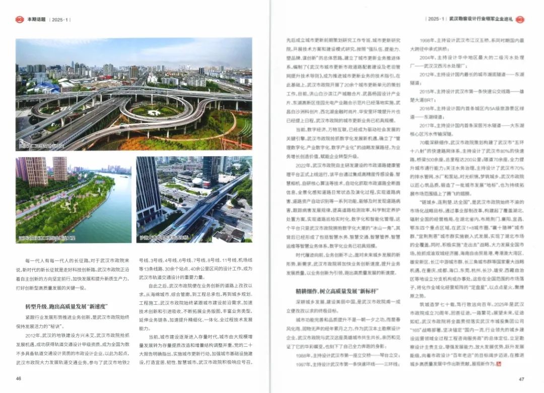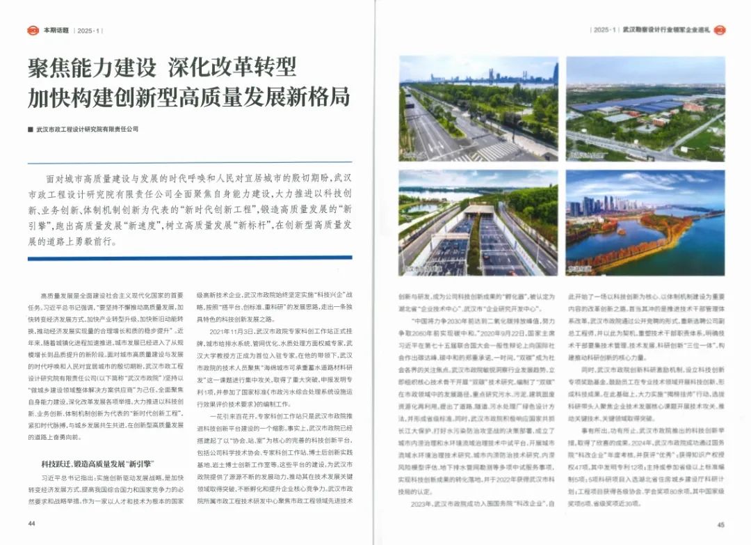? ? 近日,行業(yè)權(quán)威期刊《中國勘察設(shè)計(jì)》聚焦武漢勘察設(shè)計(jì)行業(yè),對領(lǐng)軍企業(yè)進(jìn)行了專題報(bào)道。其中,武漢市政工程設(shè)計(jì)研究院有限責(zé)任公司(以下簡稱“武漢市政院”)以“聚焦能力建設(shè),深化改革轉(zhuǎn)型,加快構(gòu)建創(chuàng)新型高質(zhì)量發(fā)展新格局”為主題,分享了其在新時(shí)代背景下的創(chuàng)新實(shí)踐和發(fā)展成果,展示了企業(yè)在高質(zhì)量發(fā)展道路上勇毅前行的風(fēng)采和活力,引發(fā)了行業(yè)廣泛關(guān)注。
