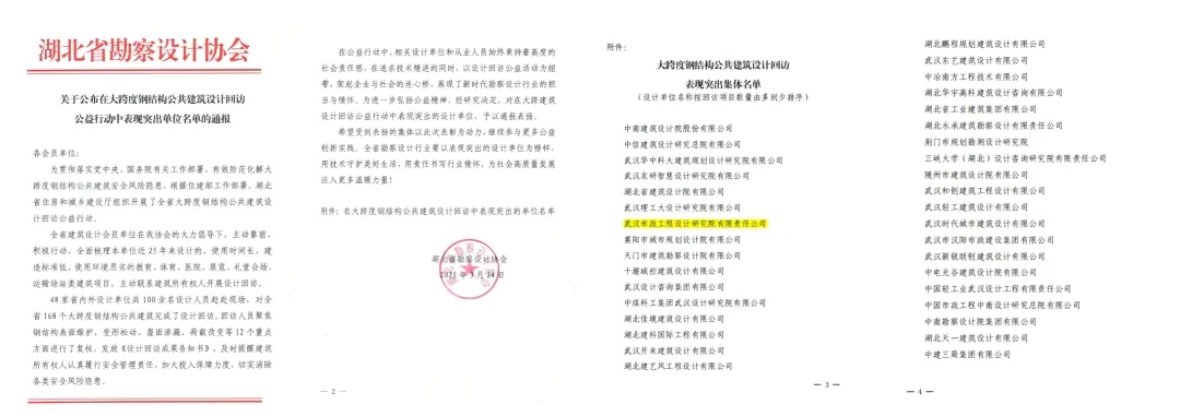 近日,湖北省勘察設(shè)計協(xié)會發(fā)布《關(guān)于公布在大跨度鋼結(jié)構(gòu)公共建筑設(shè)計回訪公益行動中表現(xiàn)突出單位名單的通報》,武漢市政院憑借高度的社會責(zé)任感與卓越的專業(yè)貢獻,榮列通報表揚名單,成為全省勘察設(shè)計行業(yè)的標桿典范。
