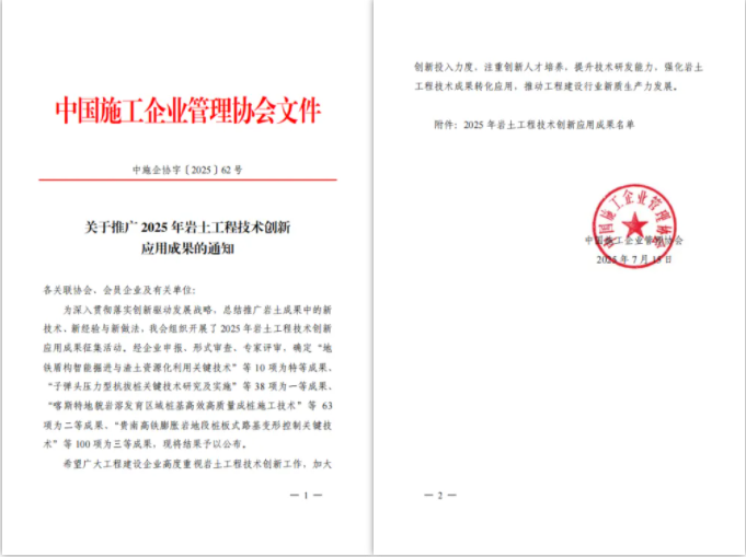? ? 近日,中國(guó)施工企業(yè)管理協(xié)會(huì)2025年巖土工程技術(shù)創(chuàng)新應(yīng)用成果結(jié)果正式揭曉。經(jīng)過(guò)企業(yè)申報(bào)、形式審查、專家評(píng)審等多個(gè)環(huán)節(jié)遴選,武漢市政院巖土博士創(chuàng)新工作室申報(bào)的“深厚富水圓礫層基坑地下水控制特種技術(shù)”、“敏感環(huán)境地鐵盾構(gòu)隧道穿越極硬巖特種技術(shù)”等2項(xiàng)技術(shù)創(chuàng)新性顯著,獲評(píng)為三等成果。