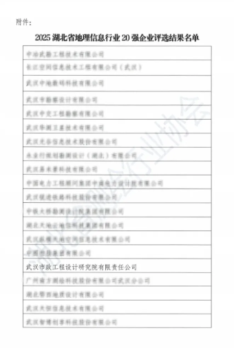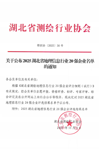 近日,從湖北省測(cè)繪行業(yè)協(xié)會(huì)傳來(lái)喜訊,武漢市政院憑借卓越的技術(shù)實(shí)力與行業(yè)貢獻(xiàn),成功獲評(píng)2025湖北省地理信息行業(yè)20強(qiáng)”。這一榮譽(yù)標(biāo)志著公司在測(cè)繪地理信息領(lǐng)域的專業(yè)能力獲得省級(jí)權(quán)威認(rèn)可,為企業(yè)發(fā)展里程碑再添濃墨重彩。