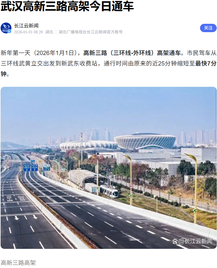 2026年1月1日,由武漢市政院參與設(shè)計(jì)的高新三路(三環(huán)線~外環(huán)線)改造提升工程主線高架通車!這條西起三環(huán)線武黃立交、東至新武東收費(fèi)站,總長(zhǎng)10.7公里(其中主線高架8.23公里)的交通大動(dòng)脈,以“主線高架+地面輔道”的立體格局,打通了光谷東向通行瓶頸,也承載著武漢市政院在綠色建造領(lǐng)域的技術(shù)突破,為武漢智慧交通建設(shè)樹(shù)立了新標(biāo)桿。