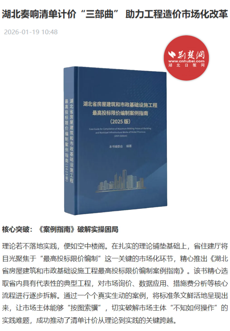 隨著《湖北省建設(shè)工程工程量清單計價指引(2026)》《湖北省園林綠化工程投資估算指標(試行)》《湖北省房屋建筑和市政基礎(chǔ)設(shè)施工程最高投標限價編制案例指南》以及《建設(shè)工程工程量清單計價(GB/T 50500—2024)及計算標準應(yīng)用與實務(wù)》等一系列規(guī)范與專著的陸續(xù)發(fā)布,湖北省圍繞國家標準《建設(shè)工程工程量清單計價標準》(GB/T 50500—2024)構(gòu)建的“理論解析—實操示范—規(guī)則指引”三位一體清單計價體系已正式形成,標志著湖北省工程造價行業(yè)邁入市場化、規(guī)范化發(fā)展的新階段。近日,荊楚網(wǎng)與湖北日報網(wǎng)專題刊登了題為《湖北奏響清單計價“三部曲”助力工程造價市場化改革》的報道。
