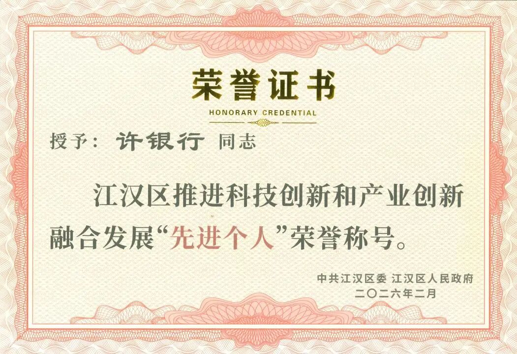 許銀行同志榮獲江漢區(qū)推進(jìn)科技創(chuàng)新和產(chǎn)業(yè)創(chuàng)新融合發(fā)展先進(jìn)個人