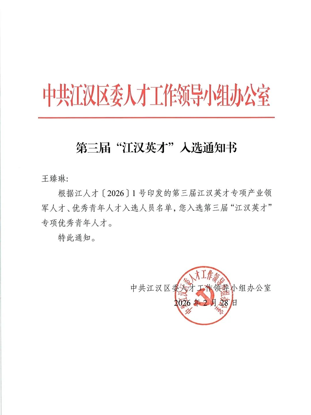 王臻琳同志榮獲江漢英才優(yōu)秀青年人才稱號