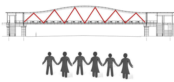 天橋采用充滿韻律感的變截面鋼桁架結(jié)構(gòu),形成多個(gè)人字形桁架梁,象征著全國(guó)人民手挽手肩并肩,精誠(chéng)團(tuán)結(jié)共同戰(zhàn)勝新冠病毒。