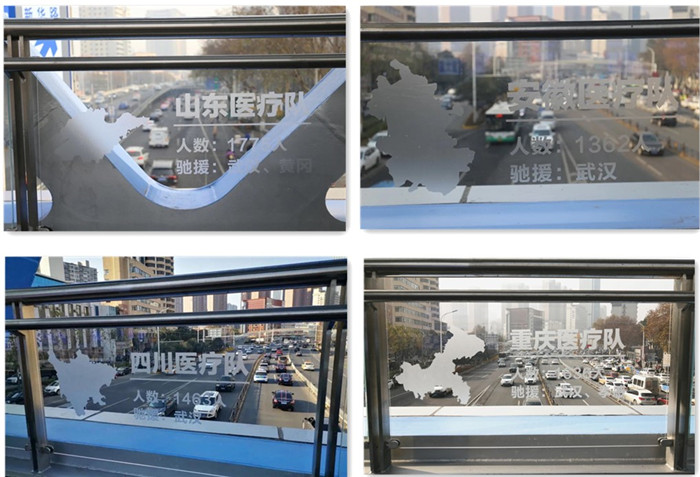 在天橋欄板上鐫刻著馳援湖北的人民解放軍醫(yī)療隊(duì)和30個(gè)省市自治區(qū)醫(yī)療隊(duì)的名稱、人數(shù)、所屬地區(qū)地圖板塊以及支援疫情地區(qū)。時(shí)值湖北武漢抗疫的關(guān)鍵時(shí)刻,全國(guó)各地的白衣戰(zhàn)士逆行而上,馳援湖北,為控制疫情、保護(hù)人民的生命安全做出了巨大的貢獻(xiàn),他們的救城之恩銘刻在每一個(gè)湖北人、武漢人的心中。