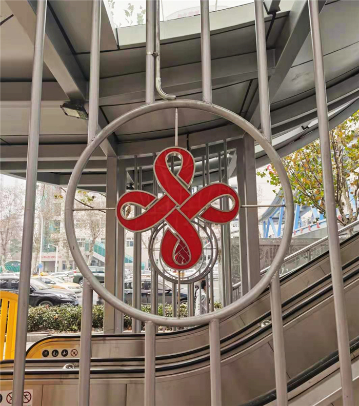 在天橋梯道及自動(dòng)扶梯入口處、橋下休憩區(qū)設(shè)計(jì)醒目的紅色標(biāo)識(shí),將中國(guó)結(jié)與紅十字融為一體,象征博愛、奉獻(xiàn)精神的白衣天使與武漢人民永結(jié)同心,中國(guó)結(jié)寓意著美好、吉祥、安康。