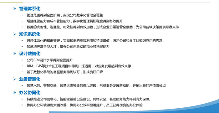 信息中心對(duì)《公司2021-2023年數(shù)字化建設(shè)發(fā)展綱要》進(jìn)行了宣貫。近年來,公司緊跟行業(yè)發(fā)展形勢(shì),立足公司實(shí)際需要,開展了以日常運(yùn)營(yíng)、項(xiàng)目管理、智慧平臺(tái)、移動(dòng)辦公等為主要內(nèi)容的數(shù)字化建設(shè)工作,取得了積極成效?!毒V要》立足當(dāng)前公司數(shù)字化發(fā)展需求,提出了管理體系化、知識(shí)系統(tǒng)化、設(shè)計(jì)數(shù)智化、業(yè)務(wù)智慧化、辦公協(xié)同化五個(gè)方面的發(fā)展目標(biāo),明確了各方面的建設(shè)內(nèi)容及相關(guān)組織保障。
