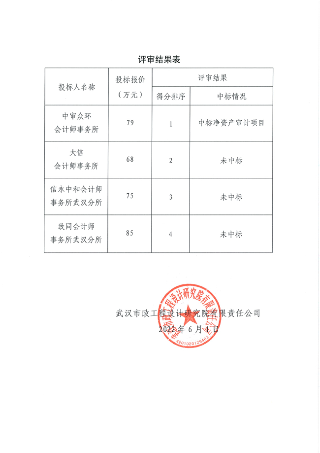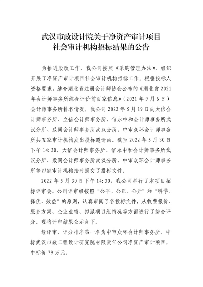 武漢市政設(shè)計(jì)院關(guān)于凈資產(chǎn)審計(jì)項(xiàng)目社會(huì)審計(jì)機(jī)構(gòu)招標(biāo)結(jié)果的公告