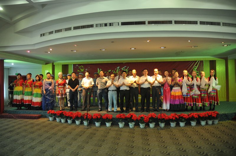 在莊嚴的《國際歌》中,總結表彰大會結束,一臺由公司黨員和入黨積極分子自編、自演的文藝演出正式開始,《再唱山歌給黨聽》、《長征》、《情深誼長》等精彩的歌舞節(jié)目贏得了觀眾的陣陣掌聲,演出現(xiàn)場洋溢著歡樂、喜慶的氣氛。演出最后,各位領導走到臺上,與全體演員和觀眾一起高唱《沒有共產(chǎn)黨就沒有新中國》,臺上臺下感情交匯,將現(xiàn)場氣氛推向高潮。