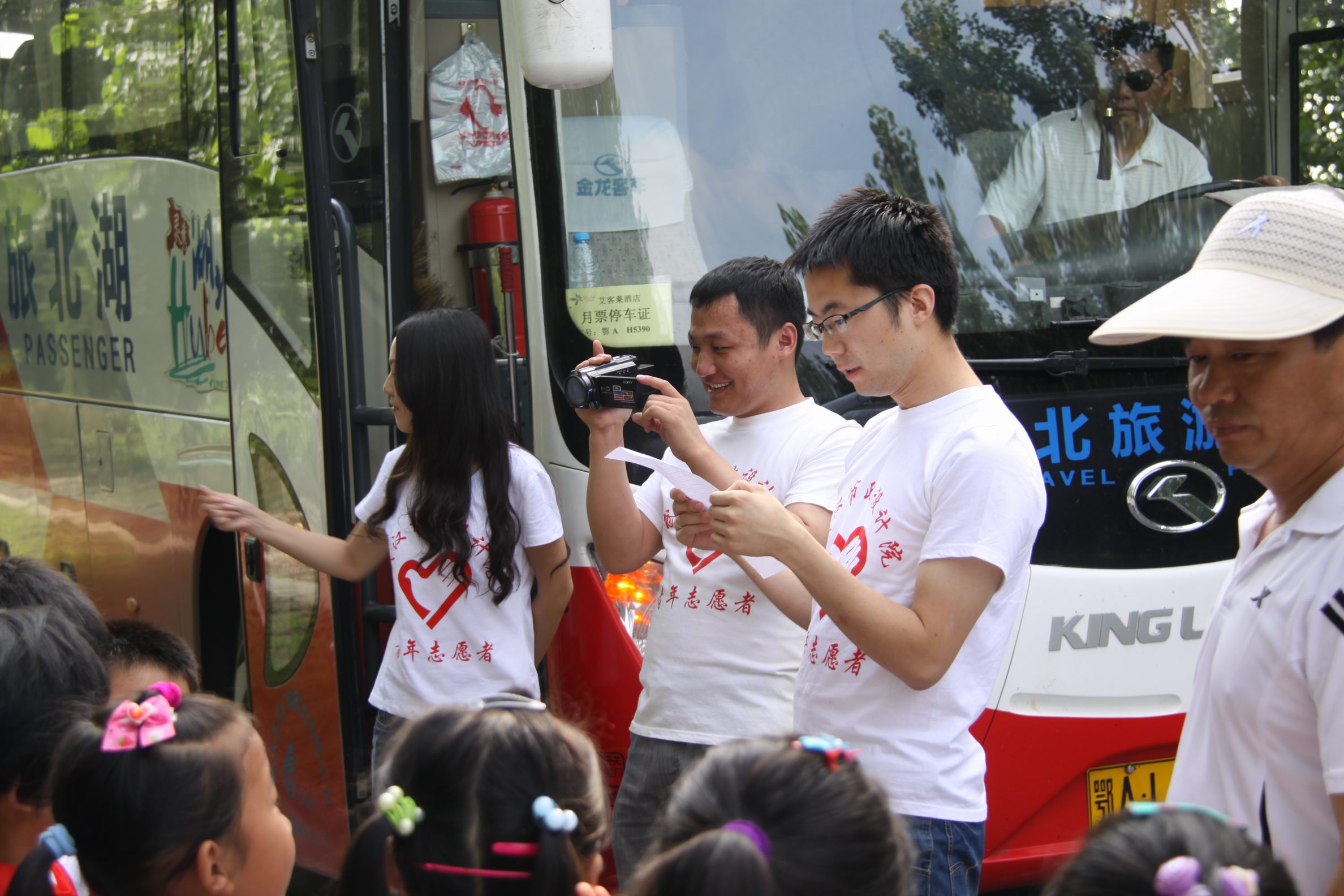 ??? 早上六點(diǎn)三十分,7名志愿者代表從公司出發(fā),赴李集小學(xué)迎接參加活動的學(xué)生及老師,受到了學(xué)生們的夾道歡迎。志愿者們?yōu)槊课粚W(xué)生送上飲料和遮陽帽,并為他們佩戴好印有自己名字的貼紙。