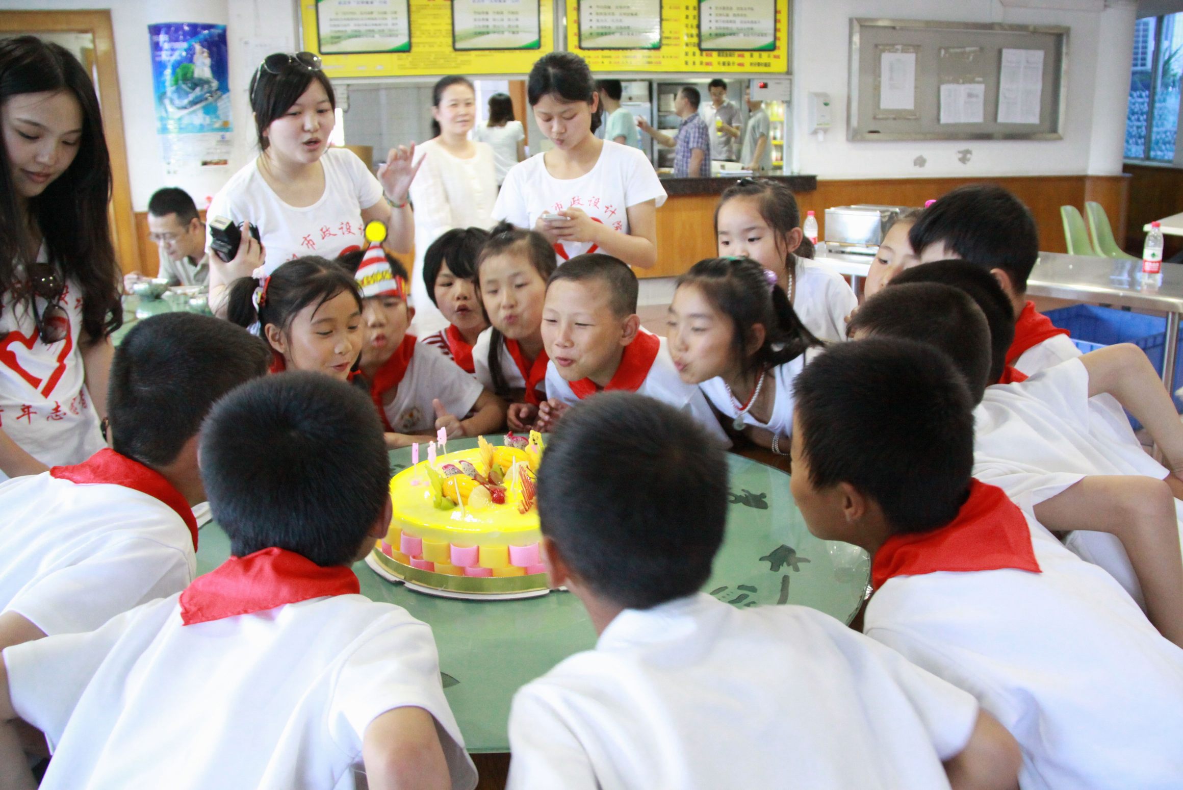 ??? 結(jié)束了一天的行程,志愿者與孩子們回到公司吃晚飯,孩子們有秩序的排隊(duì)領(lǐng)取晚餐,吃的干干凈凈。這時,志愿者們端出了準(zhǔn)備好的蛋糕,為這群7-9歲的孩子們過一個集體生日,大家唱著生日歌,一起吹滅了蠟燭。志愿者們將蛋糕分發(fā)給每一個孩子,他們吃的津津有味。