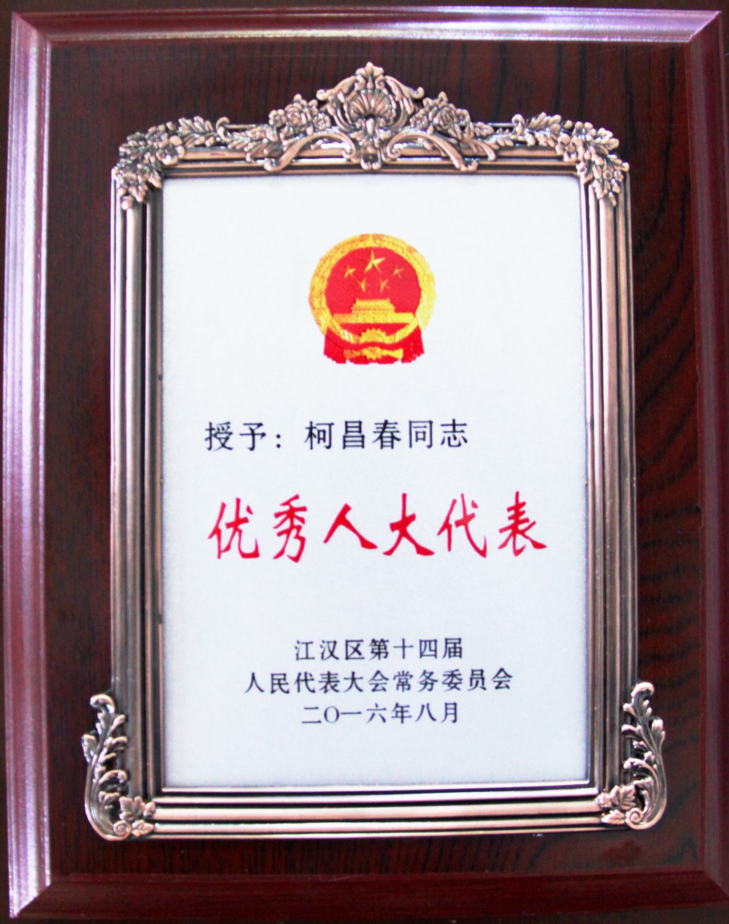??? 近日,一則喜報(bào)從江漢區(qū)人大傳來,公司董事長(zhǎng)柯昌春同志在擔(dān)任江漢區(qū)人大代表期間積極為江漢區(qū)的建設(shè)和發(fā)展建言獻(xiàn)策,被江漢區(qū)人大授予“優(yōu)秀人大代表”榮譽(yù)稱號(hào)。