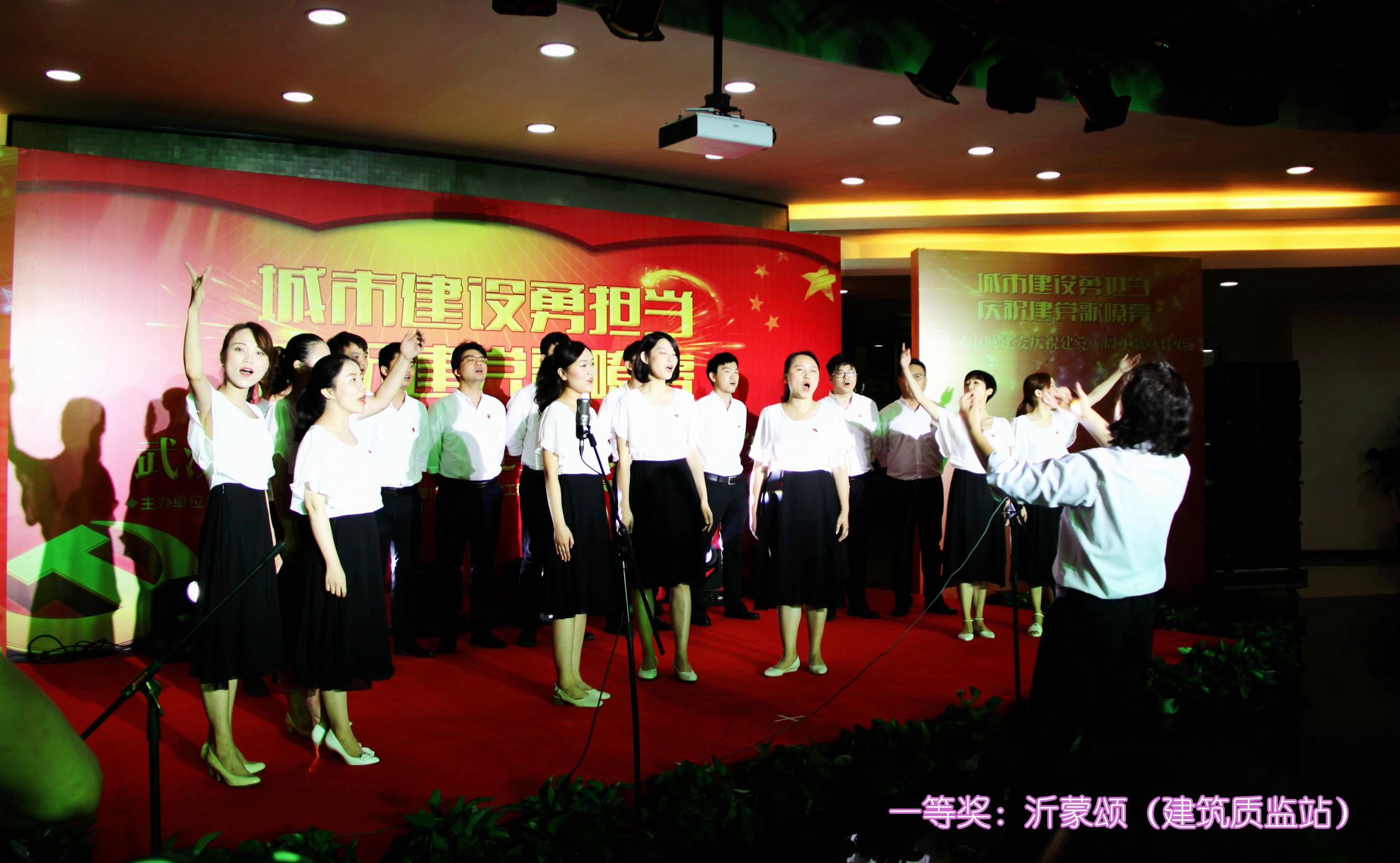 ??? 最終,公司員工張智演繹的歌曲《我愛祖國的藍(lán)天》榮獲了本次比賽的二等獎,一等獎被建筑質(zhì)監(jiān)站的合唱《沂蒙頌》奪得,陳勁超等領(lǐng)導(dǎo)分別為獲獎?wù)哳C獎,并合影留念。