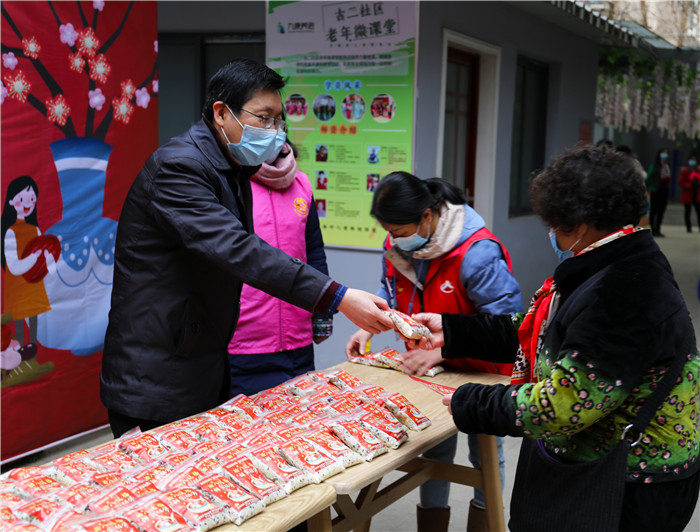 慰問期間,恰逢社區(qū)正在開展“臘八送福·甜蜜相伴”活動,談逢陽一行也加入其中,熱情地為前來的社區(qū)居民發(fā)放臘八米,送上殷切的節(jié)日祝福,叮囑他們要做好防護。