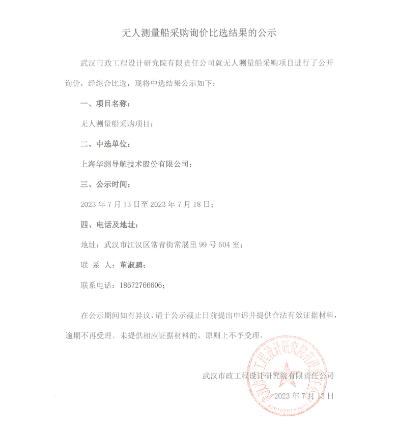 無人測量船采購詢價比選結果的公示